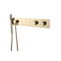 Термостатическая душевая система Boheme ZODIAC 133-SYS-G выполнена из латуни с глянцевым покрытием цвета золото. Монтаж скрытый, после установки основная часть системы расположена в стене. В комплекте встроенная часть, ручная лейка, термостат для поддержания стабильной температуры воды. Современный дизайн, ширина 54,3 см, глубина 55 см, высота 9 см. Гарантия — 5 лет.