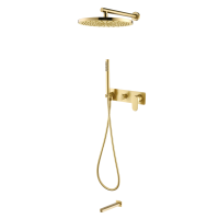 Душевая система Boheme Spectre 454-2-MG для скрытого монтажа выполнена из латуни с матовым золотым покрытием. Комплектация включает верхний душ диаметром 30 см, ручную лейку и излив. Цвет — Matt Gold. Встраиваемая часть поставляется в комплекте и полностью скрыта после монтажа, обеспечивая эстетичный внешний вид.