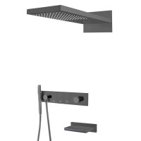 Boheme ZODIAC 132-2-SGM — душевая система скрытого монтажа, изготовлена из латуни с глянцевым графитовым покрытием Shine Gun Metall. В комплект входят верхний душ, ручная лейка и излив. Скрытая встраиваемая часть обеспечивает минимализм в интерьере и легкость обслуживания.