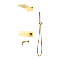 Boheme Fusion 130-2-G — душевая система скрытого монтажа с изливом. Основная часть монтируется в стену и скрыта после установки. В комплекте латунный глянцевый смеситель с покрытием Gold, верхний душ, ручная лейка. Монтаж скрытый, все элементы для подключения в комплекте.
