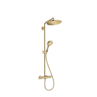Hansgrohe Croma Select S 26891990 — душевая система с настенным монтажом и встроенным термостатом. Конструкция включает круглую штангу 103.8 см, верхний душ диаметром 28 см, ручную лейку с тремя режимами и смеситель. Изготовлена из износостойких материалов, отделка — Polished Gold.