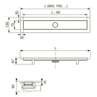 Дренажный канал TECE TECElinus длиной 60 см выполнен из нержавеющей стали и предназначен для установки в пол. Комплект включает опоры и сифон, обеспечивая удобный монтаж и эффективный водоотвод.