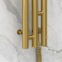 Полотенцесушитель Сунержа Терция 3.0 120х10 справа электрический в цвете золото выполнен из нержавеющей стали с глянцевым покрытием. Монтаж настенный, вертикальный, подключение скрытое. Управление размещено справа. Присутствует терморегулятор, функция памяти, таймер. Максимальная мощность — 300 Вт, класс защиты IP54, термостат с регулировкой температуры. Комплектация включает все для установки, длина кабеля 1,5 м.