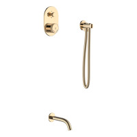 Boheme TECH смеситель 154-G предназначен для внутреннего (скрытого) монтажа на два потребителя. В комплекте: смеситель, встраиваемая часть, излив, держатель лейки и шланг. Изготовлен из латуни с глянцевой золотой поверхностью. Управление кнопочное. После установки основная часть остается скрыта в стене.