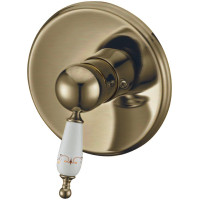 Встраиваемый смеситель Boheme Provanse 365 предназначен для душа и выполнен в классическом дизайне. Корпус изготовлен из латуни с глянцевой бронзовой отделкой. Монтаж скрытый, после установки элементы остаются внутри стены. Управление — однорычажное. Встраиваемая часть входит в комплект. Подходит для одного потребителя.