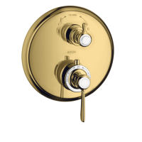 Axor Montreux 16821990 — термостатический смеситель скрытого монтажа для душа на два потребителя. Корпус и ручки выполнены из металла, цвет — глянцевое золото (Gold, Polished Gold). Управление вентильное. Требуется встраиваемая часть (заказывается отдельно), после монтажа элемент скрыт. Технические преимущества: точное поддержание температуры, гарантия 5 лет, современный стиль.