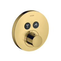 Термостатический смеситель Axor 36723990 предназначен для душевых систем с двумя независимыми точками подключения. Корпус и ручки изготовлены из металла с глянцевым золотым покрытием Gold Polished. Монтаж скрытый — после установки элемент остается невидим, видимы только управляющие элементы. Управление — вентильное, термостатический картридж обеспечивает постоянную температуру воды. Для установки требуется встраиваемая часть (поставляется отдельно).