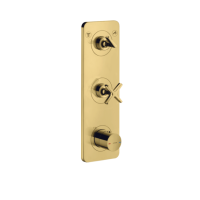 Термостатический смеситель Axor Citterio E 36703990 предназначен для душевых систем с двумя потребителями. Установка скрытым способом требует отдельно заказанной встраиваемой части, после монтажа видимой остается только лицевая панель. Корпус и ручки выполнены из металла с глянцевым золотым покрытием (Gold, Polished Gold). Оборудован термостатическим картриджем для точного поддержания температуры и вентильным управлением. Количество монтажных отверстий — 3. Гарантийный срок — 5 лет.