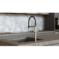 Кухонный смеситель Boheme Uno 115-MG предназначен для монтажа на столешницу. Оборудован независимым краном для подачи питьевой воды. Покрытие – матовое золото. Управление рычажное, излив гибкий. Основные характеристики: