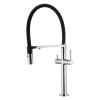 Смеситель для кухни Boheme 115-CR устанавливается на столешницу, оснащён отдельным краном для питьевой воды. Механизм управления — рычажный, излив гибкого типа облегчает использование. Корпус выполнен в современном стиле, цвет — глянцевый хром. Страна производства — Турция. Гарантия — 5 лет.