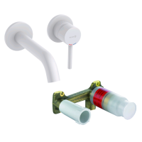 Смеситель для раковины Kludi BOZZ 382445376S монтируется скрытым способом, видимой остается только лицевая часть. Корпус и ручка выполнены из латуни с матовым белым покрытием Matt White (Bianco Opaco). Излив длиной 18 см, цельнолитой, неподвижного типа. Управление осуществляется рычагом с керамическим картриджем. Количество монтажных отверстий — 2, жесткая подводка 1/2". В комплекте идет встраиваемая часть. Донный клапан приобретается отдельно. Изготовлен в Германии, гарантия — 5 лет.